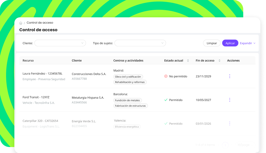 Registro de accesos Consulta y descarga las entradas y salidas de tus recursos en cada cliente. | - | |
