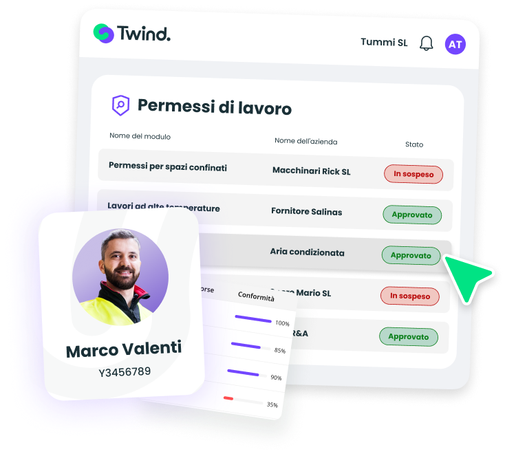 Con Twind, digitalizzi i Permessi di Lavoro dei tuoi appaltatori per autorizzare più velocemente, supervisionare meglio e garantire tracciabilità completa su ogni intervento. Tieni sotto controllo i lavori speciali senza mai bloccare le operazioni.